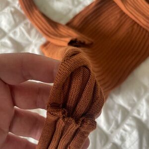 Chic ribbed bodysuit in rich rust. Sleek and stylish design. Perfect for versatile wear.