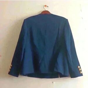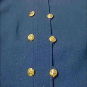 Chic navy blazer featuring a double-breasted style with striking gold buttons. Ideal for formal events.
