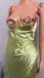 Spaghetti green dress with floral embroidery, perfect for any occasion. Features delicate straps and a flattering fit with side swoop handkerchief bottom.