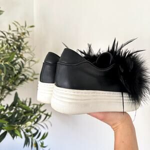 Details: Here/Now Lily Feather Pom Leather Slip On Platform Sneaker - Size: 8.5- Color: Black- Material: Leather- Features: Feather pom accent, leather, slip on, round toe, platform, comfort, rubber outsole, breathable, casual.