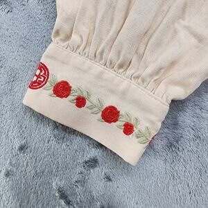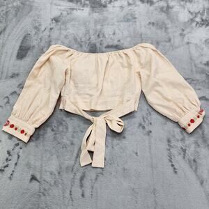 Herencia Collection Top Womens S Cream Embroidered Rosalinda Crop Square Neck Can be worn Off Shoulder Peasant Cottagecore Casual Linen Blend Lined Puff 3/4 Sleeve Wrap Front Tie Waist Side Zip Baile Essentials Festival Floral Feminine Country Western