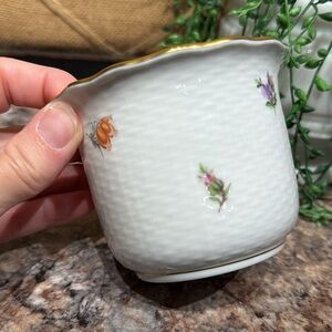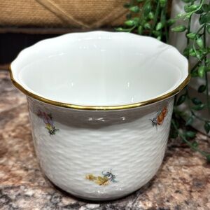 A 3” basket weave cache pot with floral print from Herend, has a couple water marks (?) on inside (please see photos).