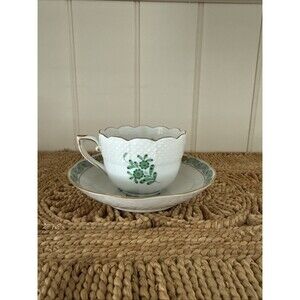 Herend Chinese Bouquet Green Cup & Saucer Gold Trim Scalloped Edges