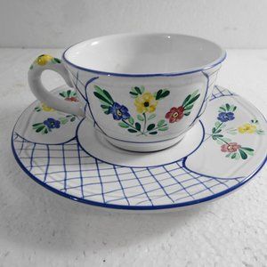 Herend Village Pottery Cup & Saucer Set Trellis Blue Trim Handpainted in Hungary