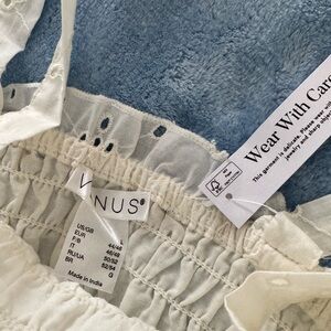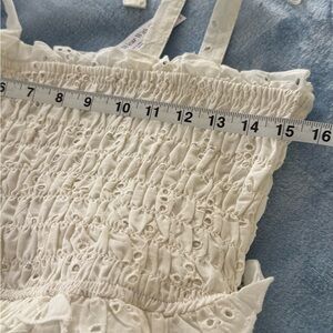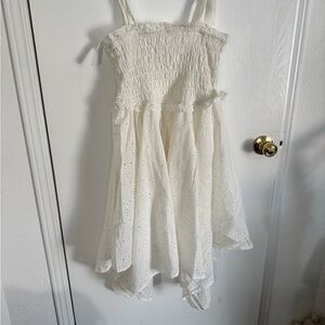 Stay effortlessly chic in this cream sundress from VENUS, brand new with tags. Featuring a flattering smocked bodice and feminine tie-front detail, this dress is perfect for weddings, resort getaways, or a breezy summer day. The high-low hemline adds a graceful touch, while the spaghetti straps and scoop neckline keep the look light and comfortable.