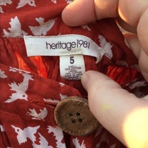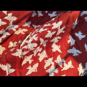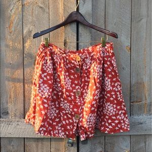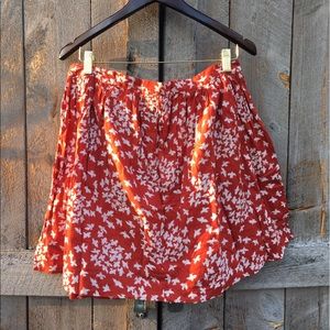 Super comfortable, lightweight and airy! A-line cut, and can be worn high waisted or lower on the hips. Buttons up the front with wooden buttons, 100% cotton and lined. Size says "5" but should fit if you typically are around a 6. Great for warmer days or layering. (Absolutely love this skirt but it no longer fits me.)