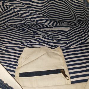 Interior lined in blue and white nautical stripes with an internal zip pocket