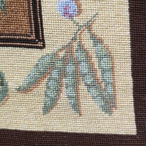 The needlework is in excellent condition. Needs to be "reshaped" to a rectangle when mounted on a backing as it has a diamond shape. The border of the work has some tape.