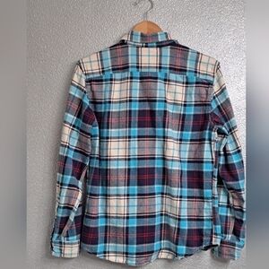 pre owned very good condition, aqua & navy blue, chest pockets, 100% cotton, embroidered American Eagle on the front, pit to pit 20" sleeve 24" length 25"