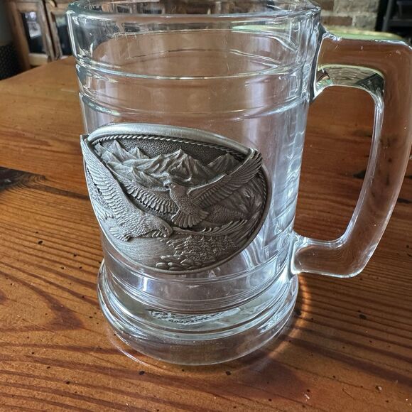 Glass beer stein with eagles, by Heritage Pewter. I see no cracks chips or scratches. Please see photos for details.