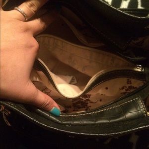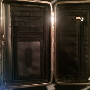 Black and sequined purse. Purse has to sides with a middle zipper divider. Two side pockets on the outside of both ends and an easy cell phone pouch. Wallet matches purse.