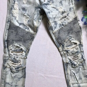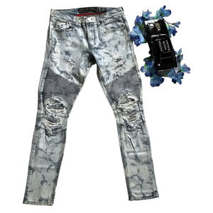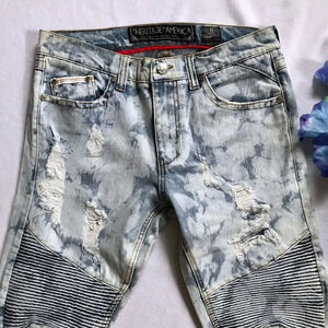 NWOT. Light Wash Skinny Jeans for Men Size W34 L32. Zipper and button for closure, 5 pockets design, distressed, has loops, ridge design above knees, seam design front and back knees, bleached light wash. This brand is known for its unique urban style. Pictures are part of description.