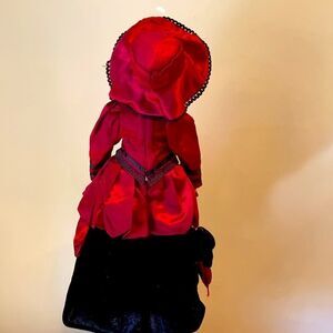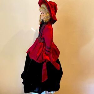 Heritage mint 1996 porcelain doll southern belle collection she is blonde blue eyes and is wearing a black velvet and red satin Dress and a large hat she is preowned used condition she is a Collectable and not a toy one eye doesn’t have eye lashes