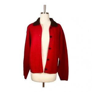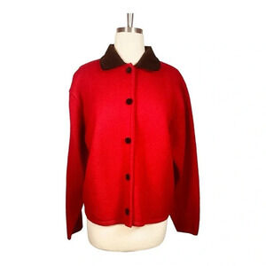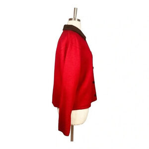Vintage Herman Geist Button Down Blazer, 100% wool, red with black velvet collar and buttons, women' size large.