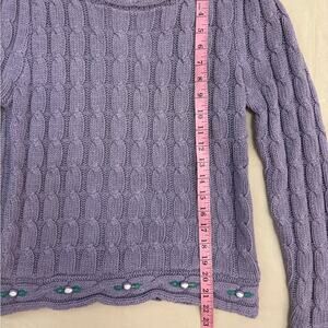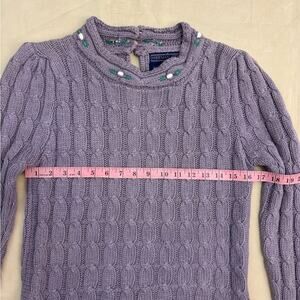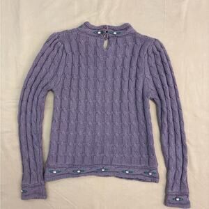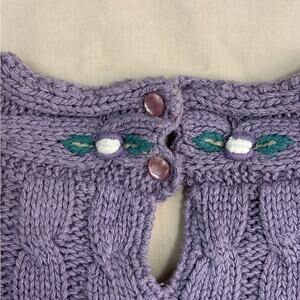 Used, great condition. Small white spot on the shoulder (shown in photo), barely noticeable. 75% silk 25% cotton. Hand embroidered. Light purple cable knit sweater. Embroidery details at crewneck collar and end of sleeves. A little bit of a puff sleeve detail. Keyhole detail on the back. May have shrunk a little. Please look at the measurements shown in the photos.