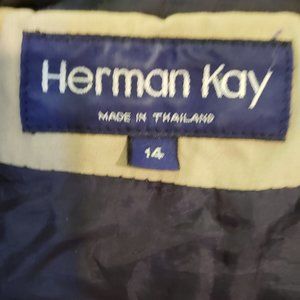 This beautiful winter coat is a Herman Kay coat, Size 14, is fully lined with a zipper, and three wooden hook/loops on the front, with one of the wooden hook missing.