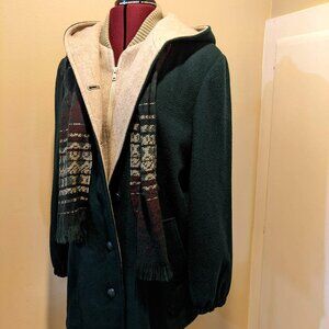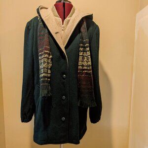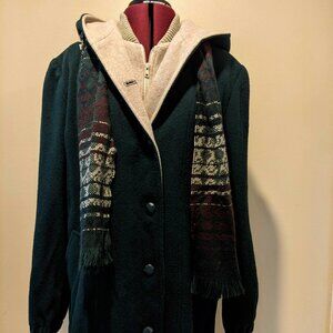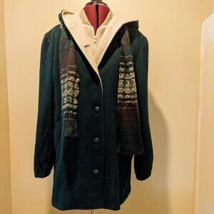 Herman Kay Women’s Dark Green Wool Hooded Coat with Attached Scarf – Size 8