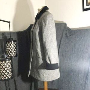 Vintage Gray coat/jacket. Black accented collar. Big buttons front closure detail. 65% Wool. Cuffed sleeve option as pictured. Pre-owned in good condition.