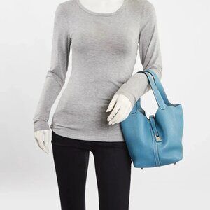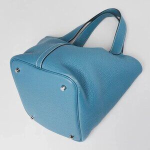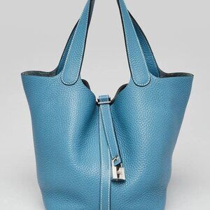 The Picotin is one of Hermes' classic creations and is adored by celebrities such as Katie Holmes (she carries an orange one) for its simple, timeless design which is inspired by a horse feed bag. The Picotin features a stylish slouchy look with an open top that can be cinched up with a leather strap. This Hermes Picotin is particularly desirable in Blue Jean Clemence leather with palladium hardware and is the perfect small and lady-like day bag. This is the medium version of the bag and comes with the Hermes padlock.
