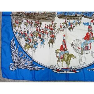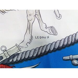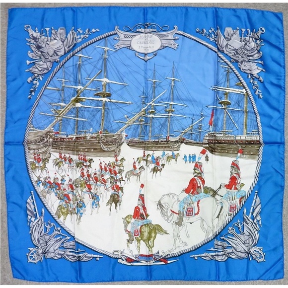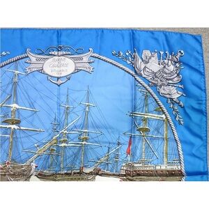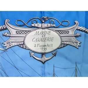 Stylish Hermes scarf with marine motifs. Features intricate ship and anchor designs. Adds elegance to any ensemble.