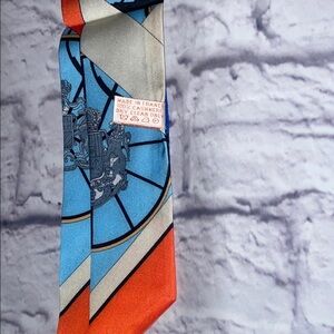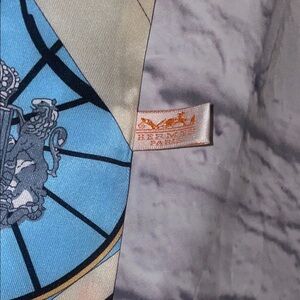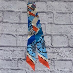 Elegant silk scarf with intricate patterns. Features blue and cream tones for women or men for bags and purses ect