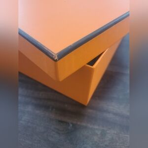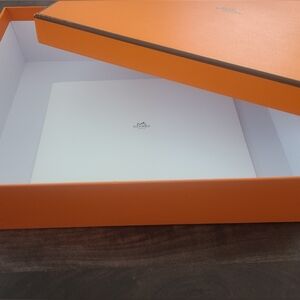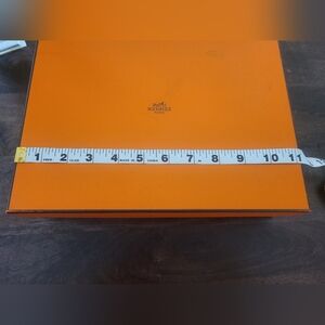 Hermes empty box. Approx 11 x 9 x 3 inches. Some dirt marks on lid. Some rubbbings on corners but no tears. See pictures for condition details and corners. Great for storying small luxury goods or to use as a display box.