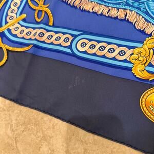 Elegant Hermes scarf with intricate blue and gold design. Features luxurious patterns and vibrant colors. Perfect for adding a touch of sophistication.