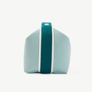 Made in France, this small Bride-a-Brac case from Hermes is crafted with a sturdy canvas in a light Eucalyptus blue, and features silver-tone hardware, a teal polycotton strap with snap closures and white edges, an embroidered "H" motif on the front, a top zip closure with a leather pull, and a herringbone canvas-lined interior containing three slip pockets.
