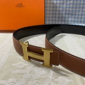 Luxurious brown leather belt. Features iconic gold H buckle. Perfect for any occasion.