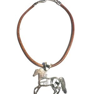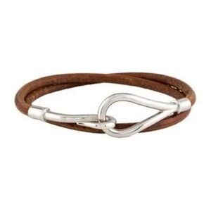 This exquisite Hermes accessory features a rich brown leather strap that wraps multiple times, complemented by a sleek silver-toned hook clasp. The high-quality leather and modern design make it a standout piece in any jewelry collection. I love these and have several in various colors. I use them as a choker necklace. I add a charm and hook it . It is rally classy on. I added a charm for representation. Horse not included. I have gun metal and silver listed.