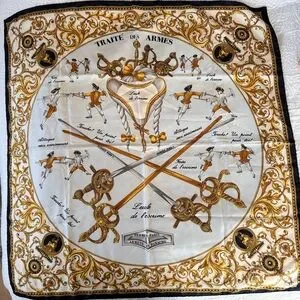 Hermes Carre 90 Traite des Arms Black Gold and White Silk Scarf with COA
