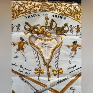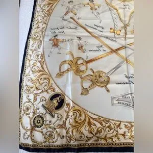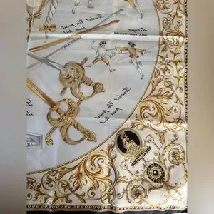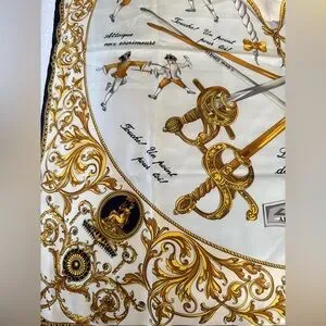 Luxurious silk scarf featuring intricate gold and white designs. Perfect for adding a touch of elegance to any outfit.