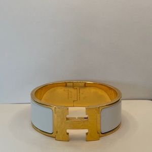 Hermes Paris. Wide white bracelet in enamel with gold plated hardware. Made in France. Circumference: 7.5" | Width: 0.79". Lightly used. Price negotiable. Will provide proof of authentication.