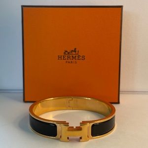 Hermes Paris. Narrow Noir bracelet in enamel with rose gold plated hardware. Made in France. Circumference: 7.5" | Width: 0.47". Never used, perfect condition. Price negotiable. Will provide proof of authentication.