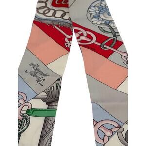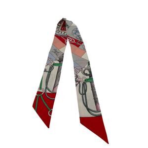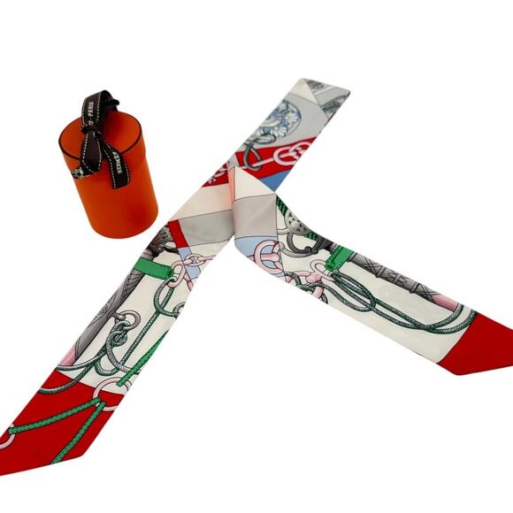 Elevate your style with this stunning Hermès Cliquetis Twilly, featuring a vibrant red, white, and green multicolorway. Designed by Julie Abadie, this exquisite scarf showcases a classic Hermès equestrian theme, complete with stylized stirrups, ropes, and chains. Crafted from 100% luxurious silk twill, it exudes elegance and sophistication. This Twilly comes with its signature orange tubular box, making it a perfect gift or a treasured addition to your collection.