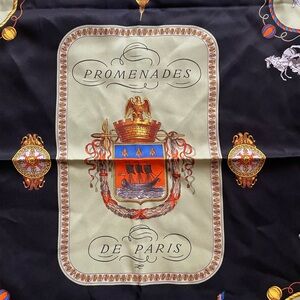 Vibrant Hermes silk scarf featuring Parisian scenes. Rich colors and intricate design. Size is 34”x 34”, comes with original box