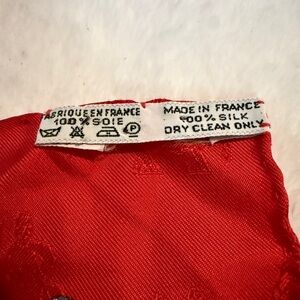 Vibrant silk scarf featuring a winter scene with figures and intricate patterns. Dominant colors include red, blue, and cream.