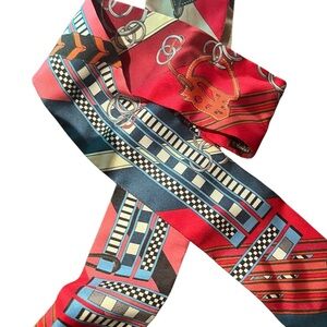 Luxurious silk scarf with equestrian motifs. Features vibrant colors and intricate design. Perfect for a stylish touch. Twilly is in excellent condition and comes with original Hermes orange box.