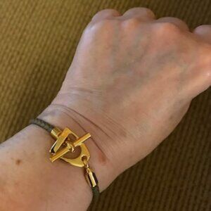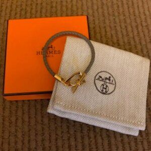 Braided single tour bracelet braided in etoupe swift calfskin leather with 18K yellow gold plated stirrup clasp.
