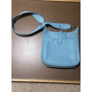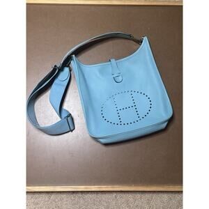 Stunning Hermès Evelyne III PM bag in a refreshing light blue Clemence leather. This iconic bag features the signature perforated “H” logo, a spacious interior, and an adjustable canvas strap for versatile crossbody wear. The bag includes its original Hermès box and dust bags, making it a perfect addition to any luxury collection.