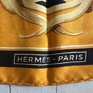 Luxurious Hermes scarf with intricate gold patterns on a black background. Perfect for adding elegance to any outfit. 33x33