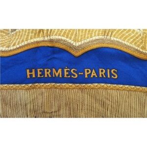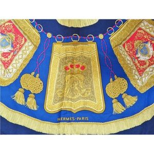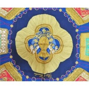 Luxurious silk scarf featuring a bold gold and blue pattern. Ideal for elevating any ensemble.