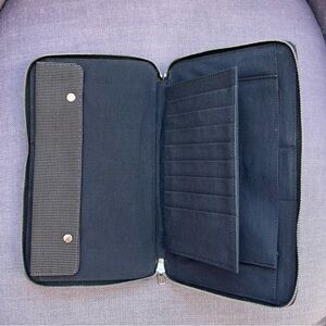 Authentic HERMES gray canvas zip wallet/organizer. This wallet is large; much bigger than standard zip around wallets. Can easily fit iPhone, passport, etc. Inside has 7 card slots, 2 open compartments, and 1 snap pocket inside. Nylon compartment, easy to clean, cloth exterior. Box not included. No callouts, just used condition
