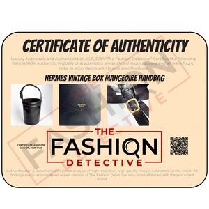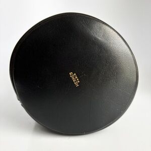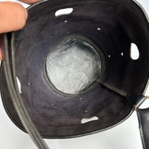 Preowned, vintage Hermes Sac de Mangeoire bag, likely made in the 1960s. Made from black box calf leather, its unique shape was originally influenced by French horse feeding troughs, and a nod to Hermes equestrian beginnings. Unlined, it features an adjustable strap that can be shortened for hand carry or lengthened to carry on the shoulder. The perforated holes can be adorned with a favorite scarf for added flair as we show in image 2 (scarf is shown for styling inspiration and is not included with this bag).