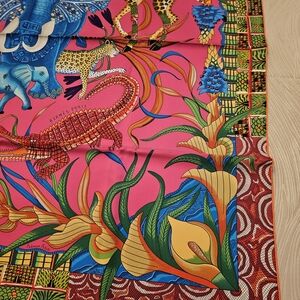 Vibrant Hermes scarf featuring a jungle theme. Dominant pink background with blue elephants and intricate animal designs. Accents of green, yellow, and red add depth.