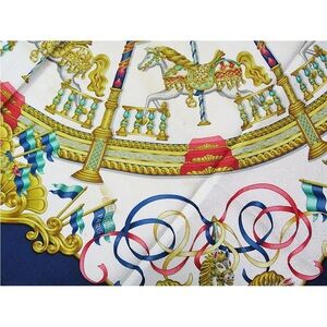 Vibrant silk scarf with carousel motif. Features red, blue, and gold accents.