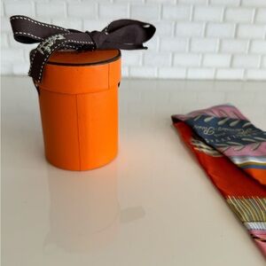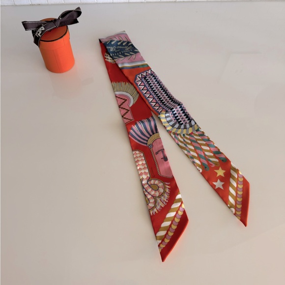 Vibrant Hermes Twilly scarf. Features a mix of patterns. Perfect for adding a pop of color.