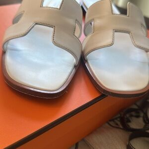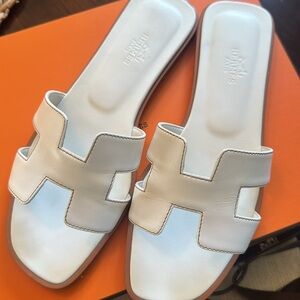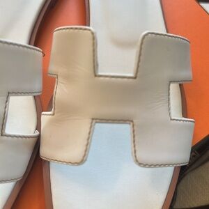 Hermes Orans white 37 1/2. They have creasing on the leather, please see detailed pics, some wear on footbed. I go between a 7 and 7 1/2 and found these fit best, my foot goes pretty much end to end but does not hang off. Measures 9 1/2 inches long. Ask any question. I tried to take detailed pics to show wear. Receipt not included, just to show proof of purchase. Thank you
