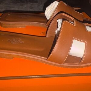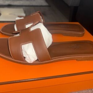 Pre-owned Hermes Oran sandal in EU 37.5. Comes with original box and dust bags. Please see all photos