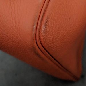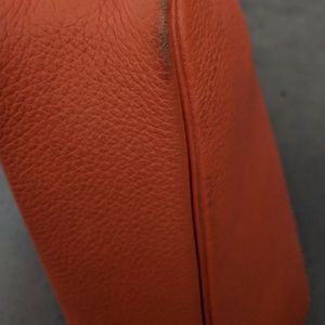 Fabulous and authentic Hermes Massai bag! Gorgeous orange clemence leather, made in France. Lovingly carried with tons of life left. Includes two shoulder straps and dustbag. Previously loved with signs of use - there is light wear to the four corners, a small black mark (the size of a pen point) on the back, light rubbing to the back, and wear to the resin on the shorter strap.